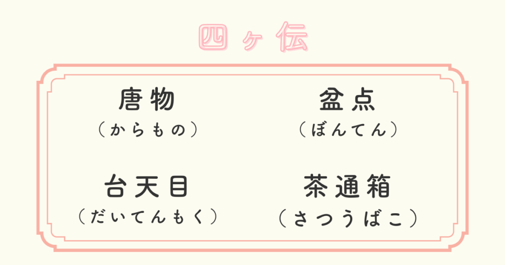 四ヶ伝は、「唐物」「盆点」「台天目」「茶通箱」の4つあります。